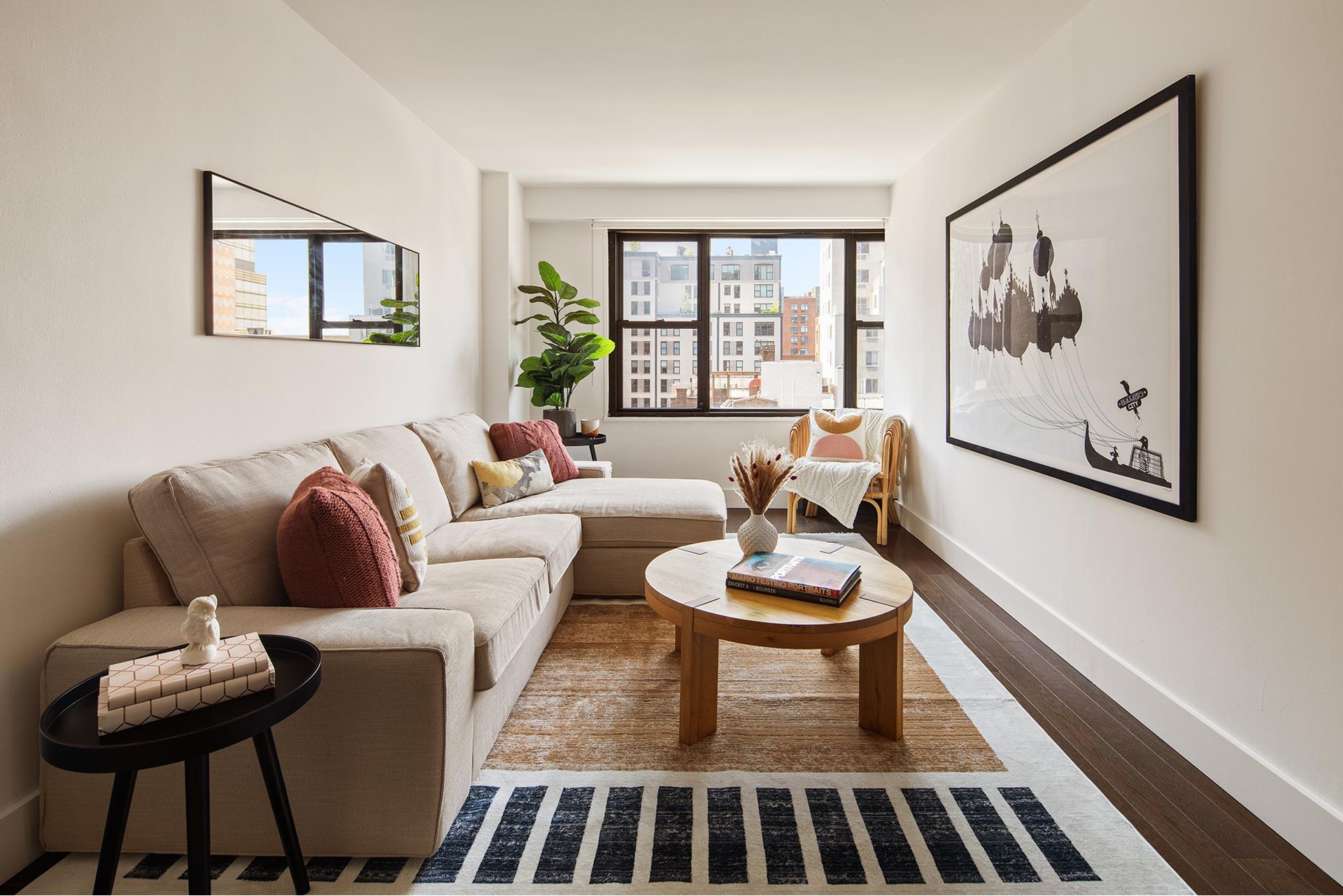 Welcome to Apartment 8F at 85 Livingston Street - a beautifully designed junior one-bedroom offering comfort, convenience, and abundant natural light in the heart of Downtown Brooklyn. This south-facing unit boasts oversized windows that flood the space with sunshine throughout the day, enhancing the warm and modern ambiance.